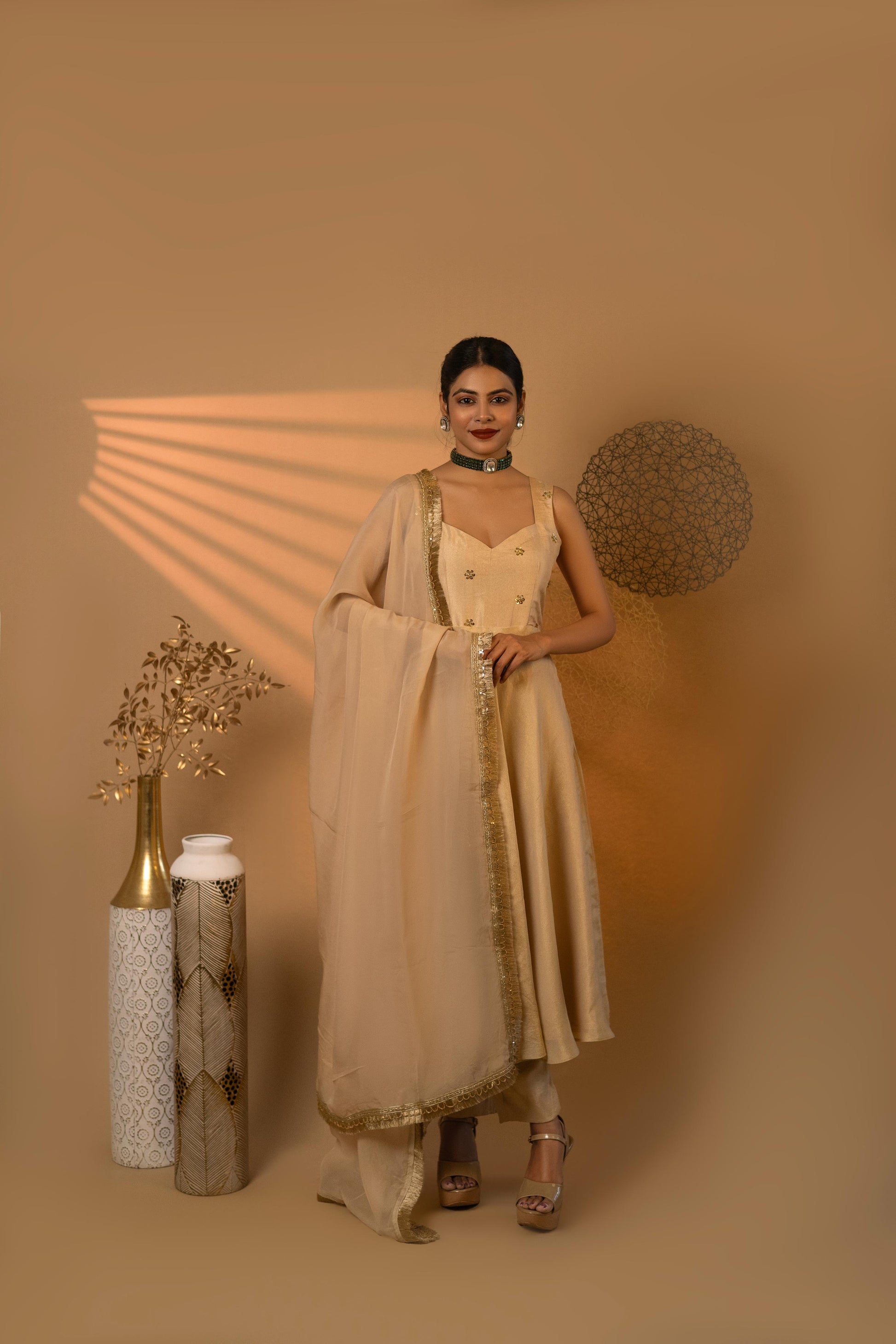 Swirl Kurta set — flowy, flirty, and made to move. The top’s got a sweetheart neckline and a deep back cut-out that shows just enough. Paired with straight pants and a dupatta trimmed in shine. The Cosmo Silk catches light with every step — feels light, looks luxe.