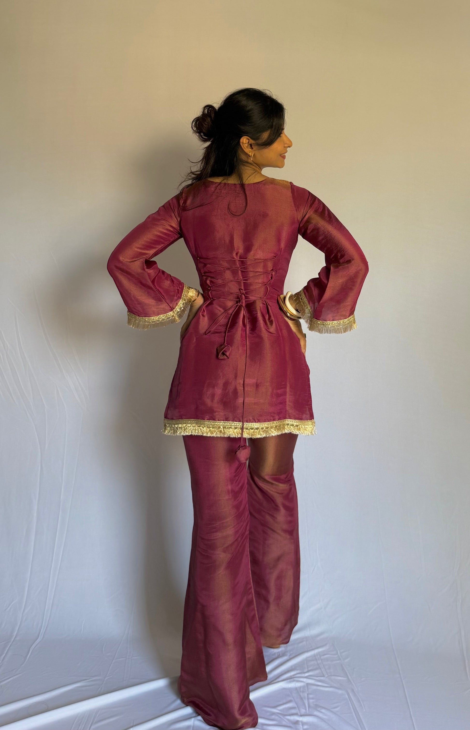 A total showstopper – this corset-style bell-sleeve top with matching bell-bottom pants is all about drama & glam. Pair it with the optional dupatta for a desi twist or wear it bold as is. Because the real Patakha is YOU 🔥