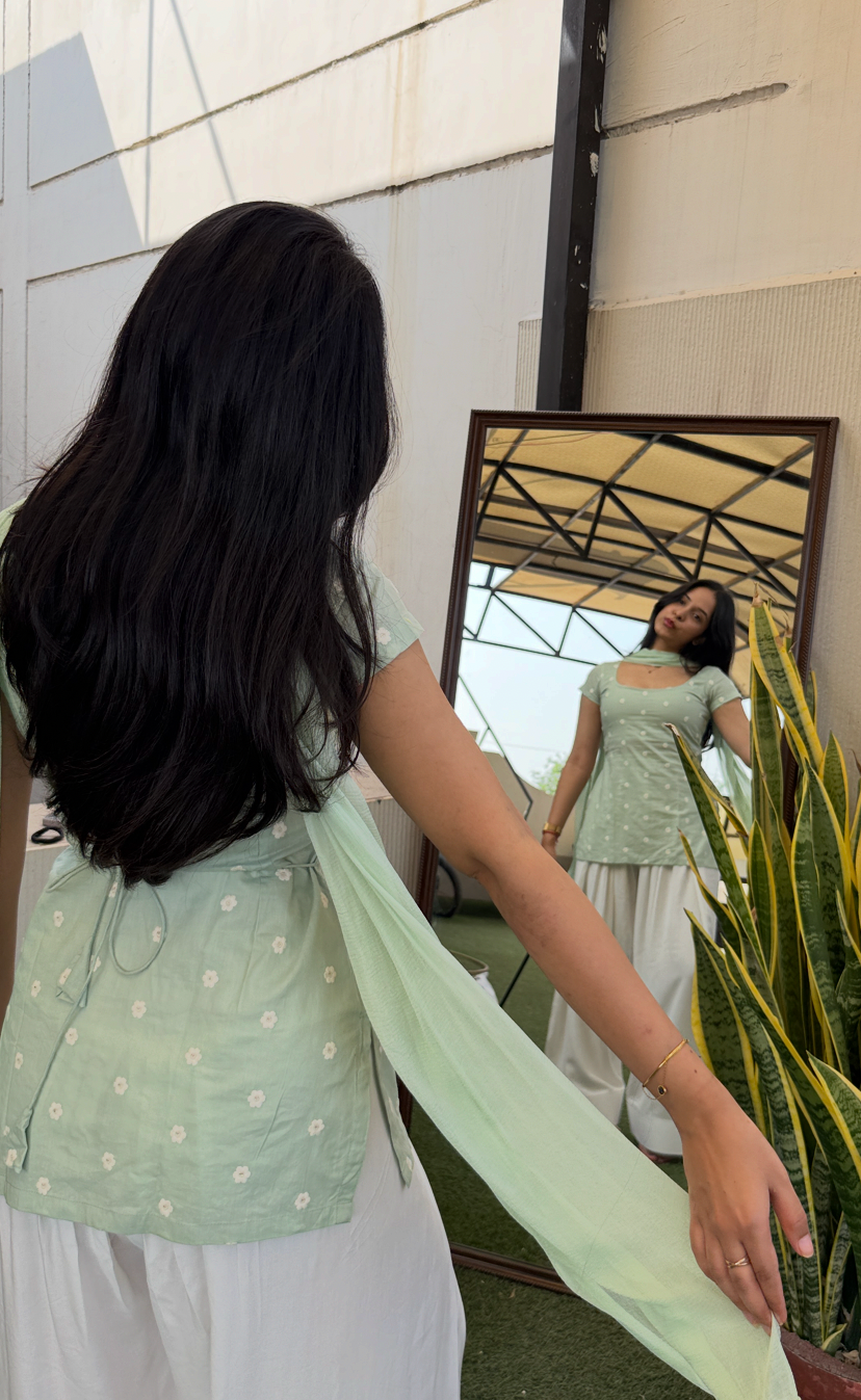 The geet Kurti Set is your Y2K-fantasy — flirty, playful, and effortlessly glam. With half sleeves, a cinched-back drawstring, a chiffon dupatta, and a farshi salwar, it’s the perfect 3-piece set for days you want full main-character energy.