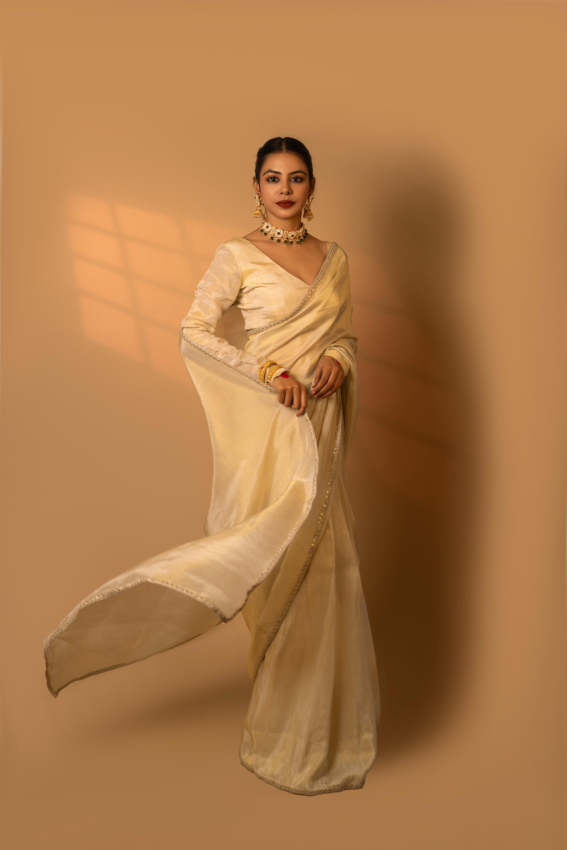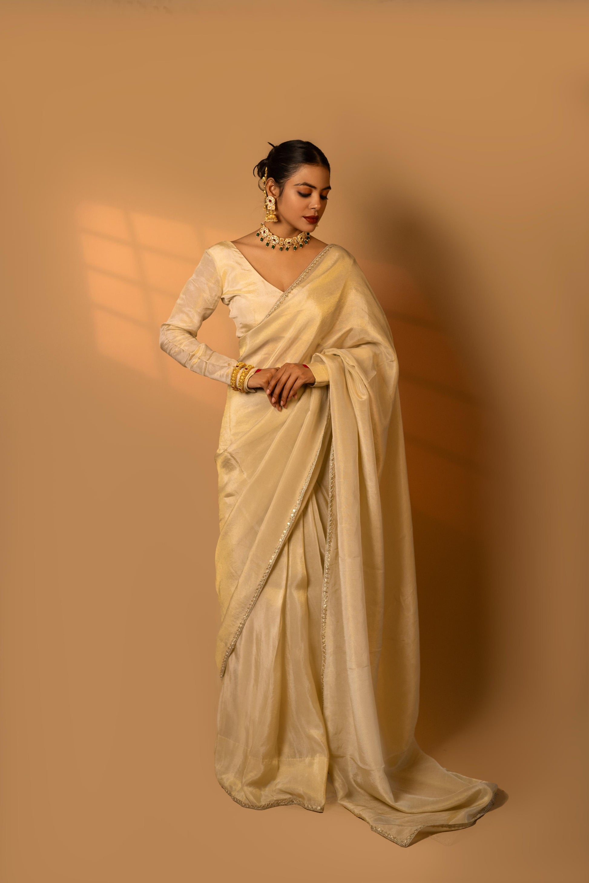 Ready-to-wear saree in soft Cosmosilk, finished with a subtle gold border. Pre-stitched for an effortless drape, it moves with you and catches light in every step.