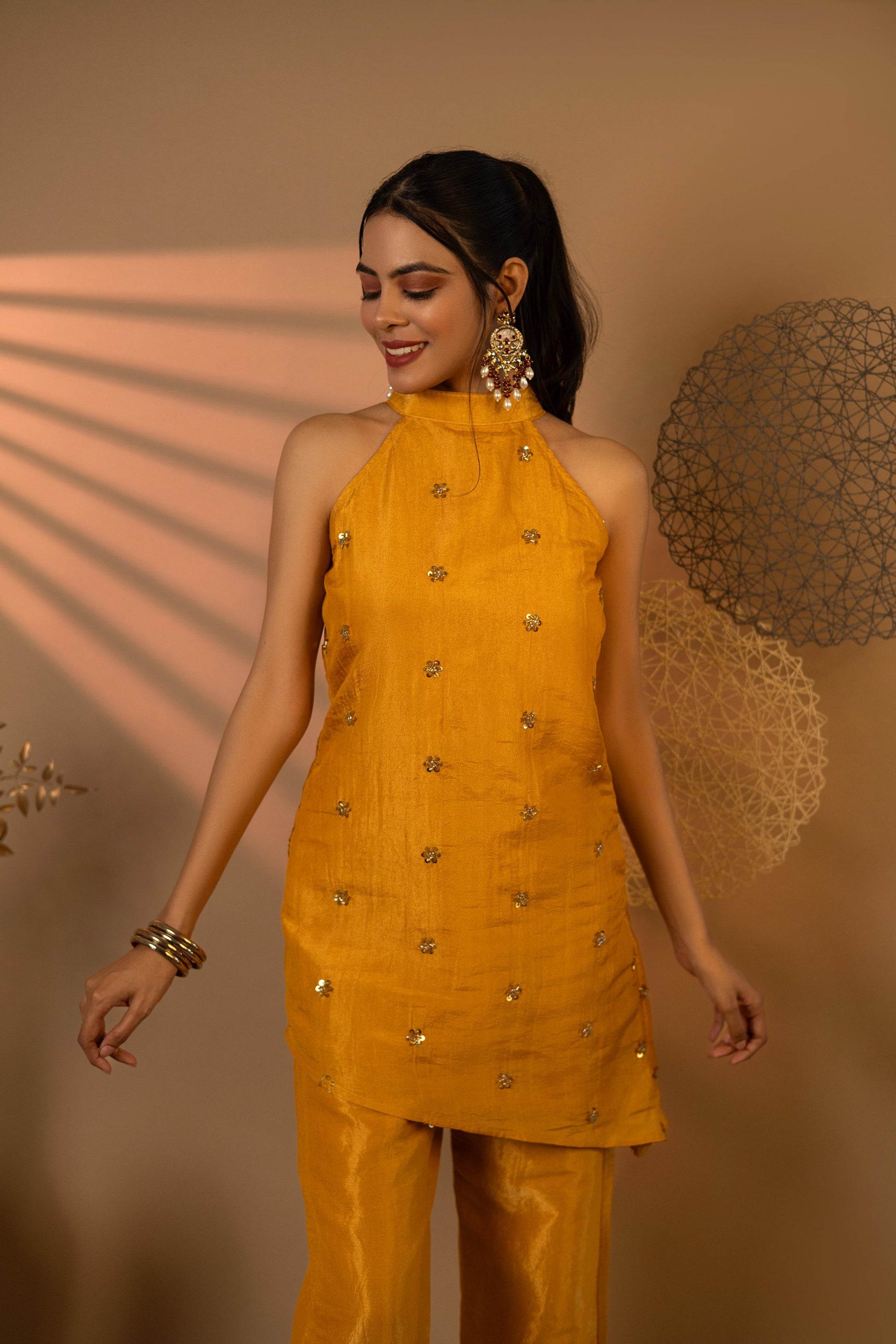 Tilt Fit set in Cosmosilk, featuring a hand-embroidered top with an asymmetrical hemline. Paired with straight pants and soft lining for all-day comfort.
